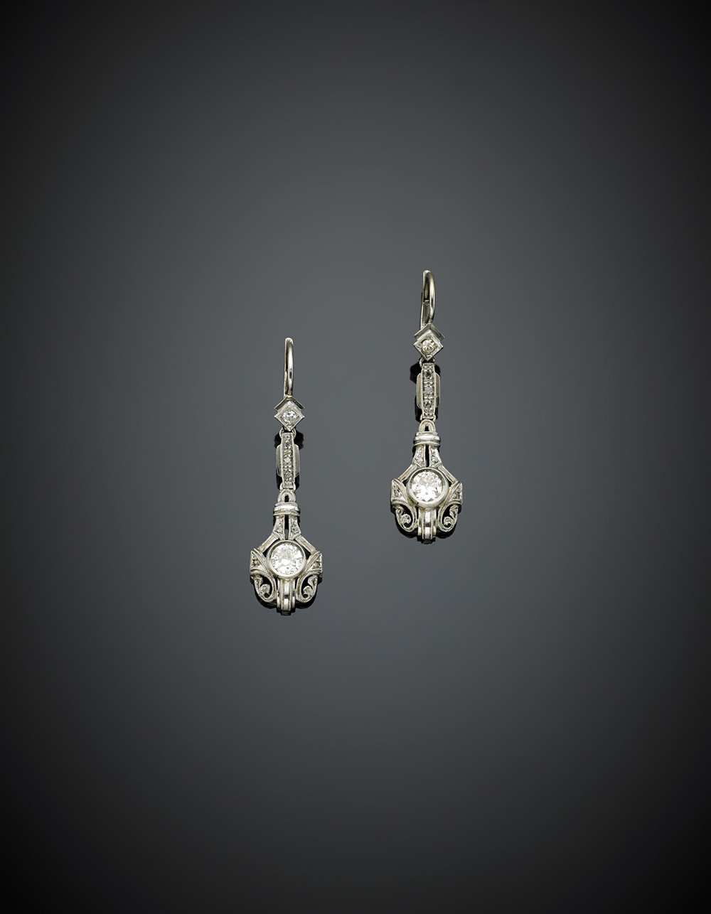 Orecchini pendenti in oro bianco rifiniti con diamanti dove nel centro i due più grandi sono complessivamente di ct. 1,00 circa g 4,70, lungh. cm 3,80 circa.