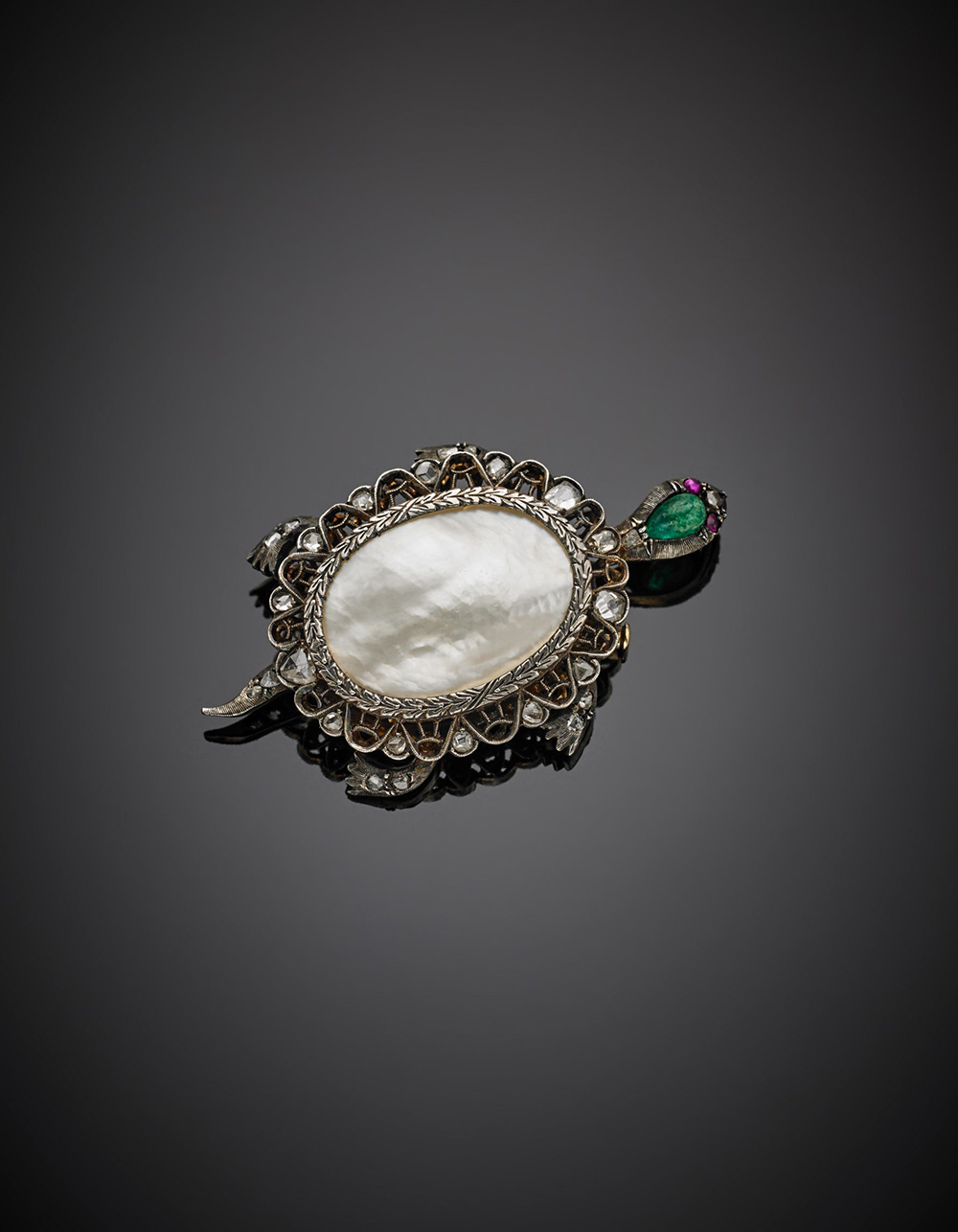 Spilla a guisa di tartaruga in oro giallo e argento, diamanti irregolari e madreperla, rifinita con smeraldo e rubini, g 14,38, lungh. cm 5,10 circa.
