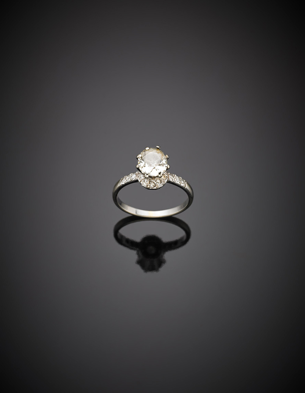 Anello solitario in oro bianco con diamante di ct. 1 circa, taglio ovale old mine, nel gambo altri diamanti huit huit, g 2,80 misura 14/54.White gold oval old mine cut ct.1 diamond ring with huit-huit diamonds on the stem, g 2.80 size 14/54.