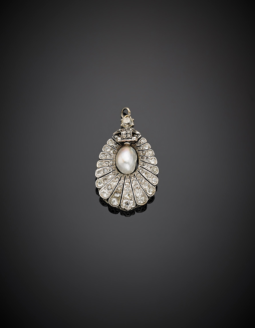 Pendente a conchiglia in oro bianco con perla a goccia naturale d'acqua salata e diamanti, g 10,11, lungh. cm 4,40 circa.