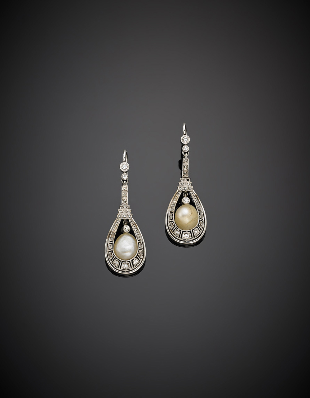 Orecchini pendenti in platino e diamanti con due perle naturali d'acqua salata, g 8,96, lungh. cm 4,20 circa.
