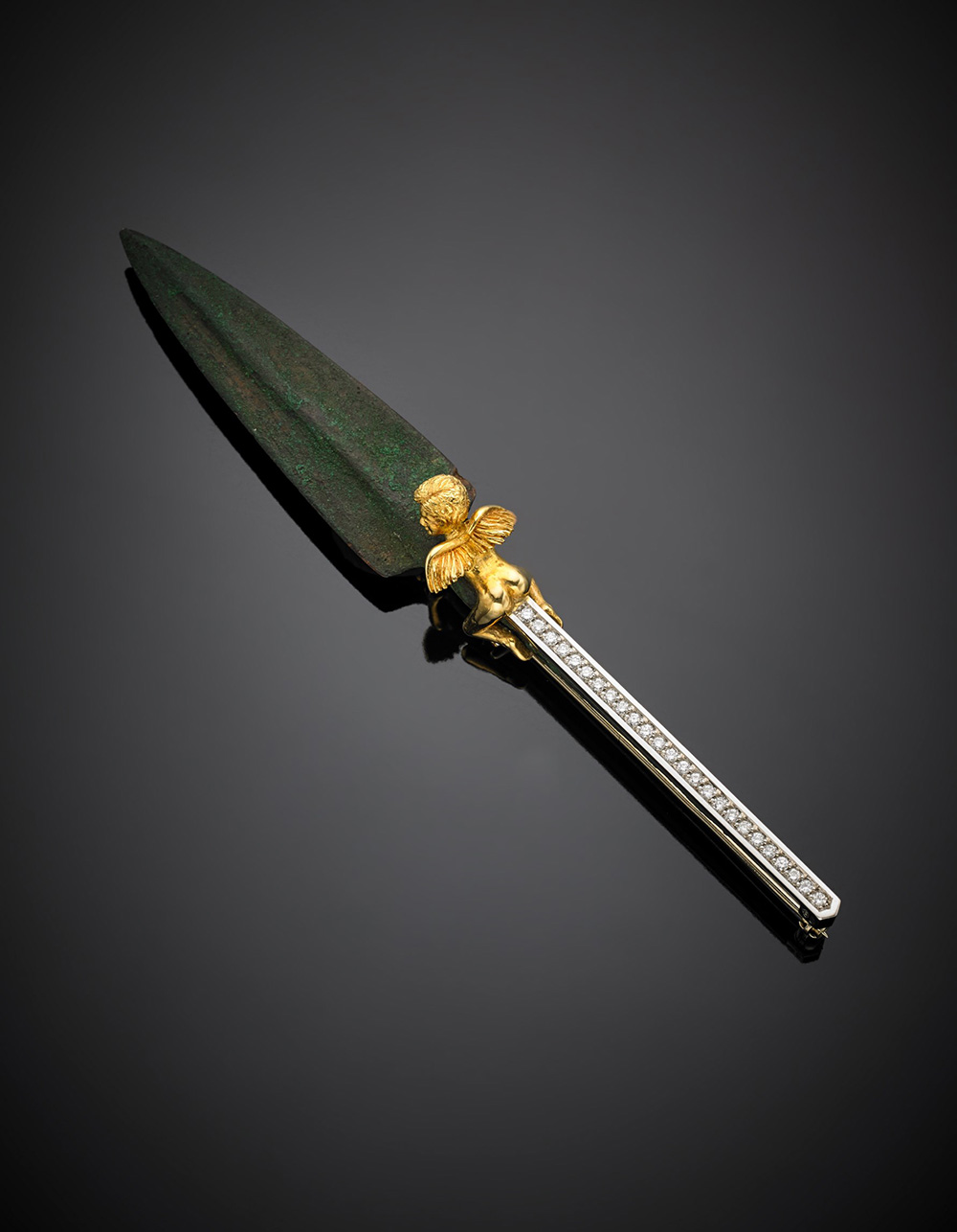 Broche in oro bianco e giallo con puttino/simbolo fallico a legare una punta di freccia in bronzo, rifinita in diamanti, peso lordo g 32,19, lungh. cm 13 circa. Con garanzia originale