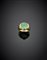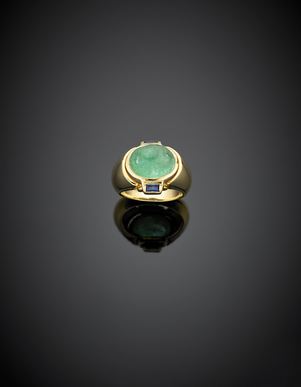 Anello in oro giallo e bianco con zaffiri a baguette ed al centro uno smeraldo ovale cabochon, g 16,80 misura 13/53.