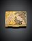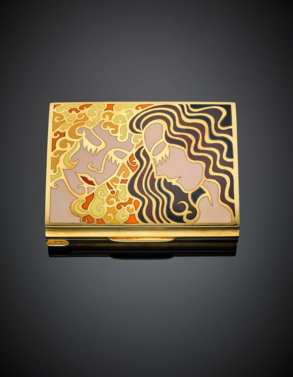 Portasigarette in oro giallo e smalti a raffigurare due visi di donna, di forma rettangolare bombato sopra g 157,80, lungh. cm 8,70, largh. cm 6,90, h cm 2 circa. Con custodia originale