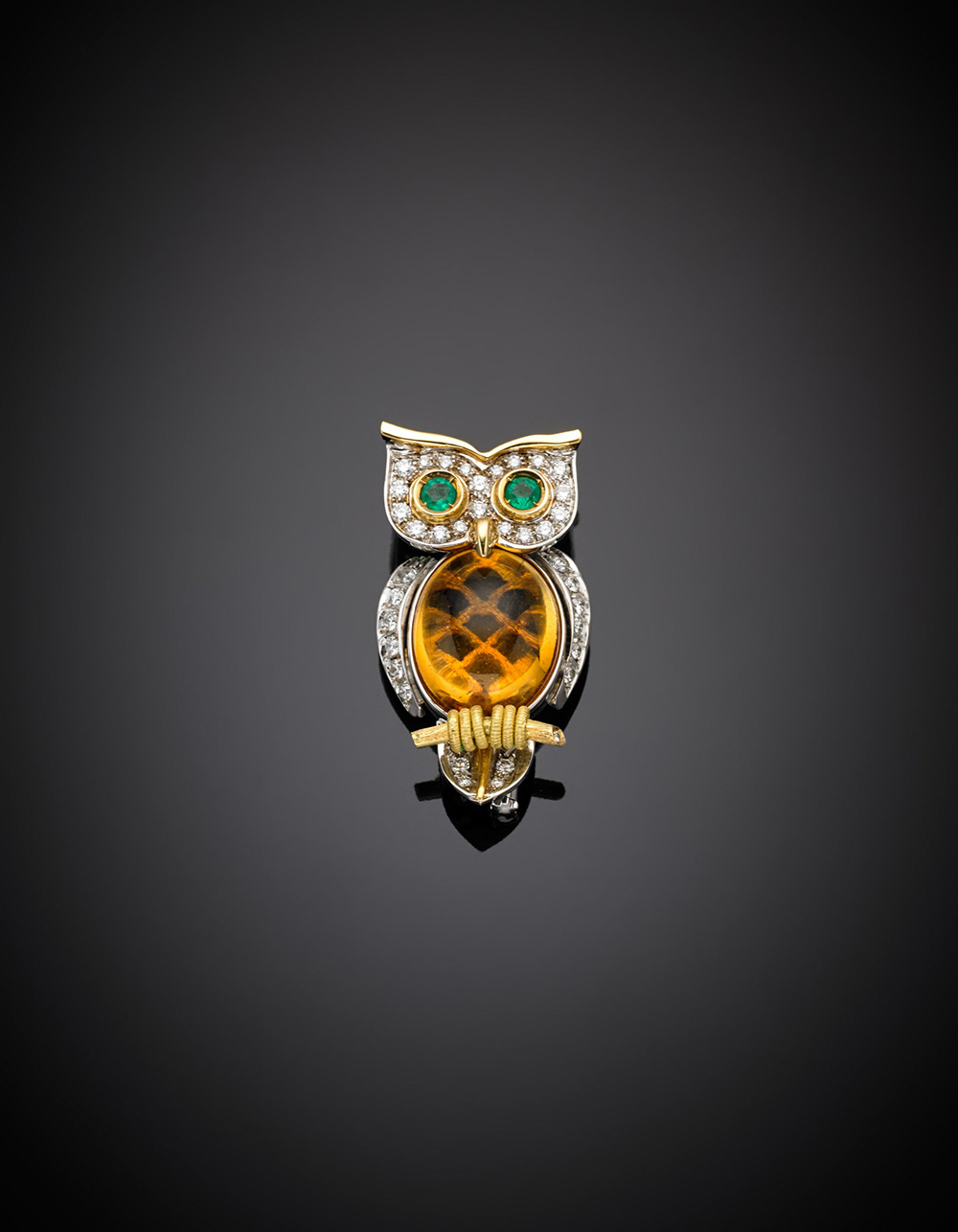 Broche in oro giallo e bianco a guisa di gufo con quarzo citrino cabochon, smeraldi rotondi e rifinita in diamanti, g 17,30, lungh. cm 3,90 circa.