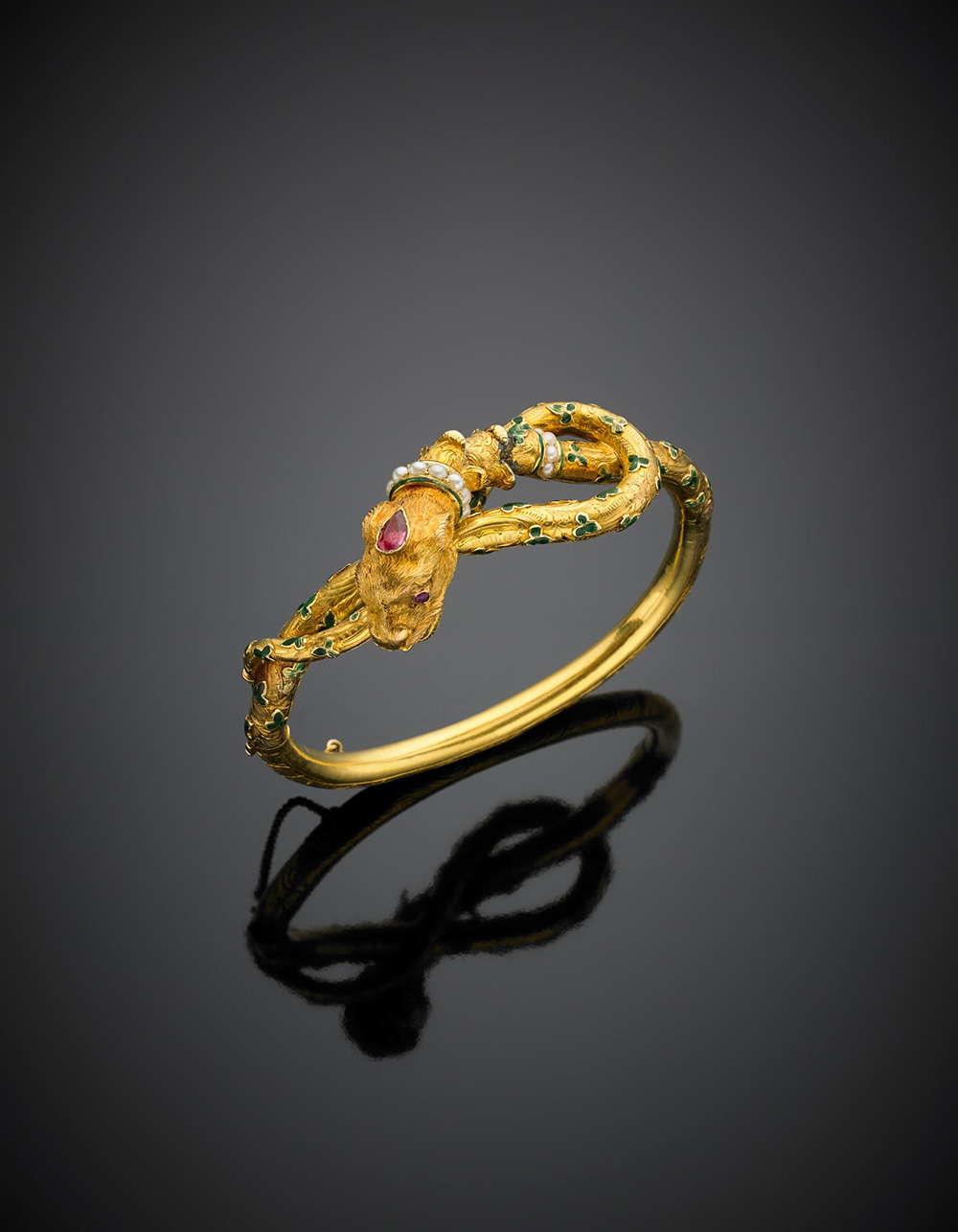 Bracciale rigido in oro giallo a guisa di felino rifinito con smalti verdi, perle e rubini g 26,40, diam. cm 6. (lievi difetti)