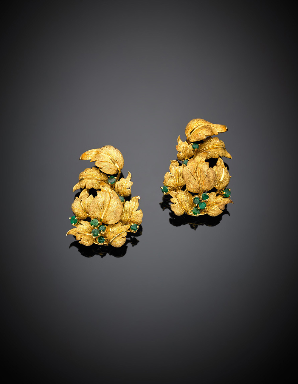 Orecchini a lobo con clip a guisa di foglie in oro giallo cesellato e piccoli smeraldi, g 30,72, lungh. cm 4 circa.