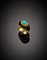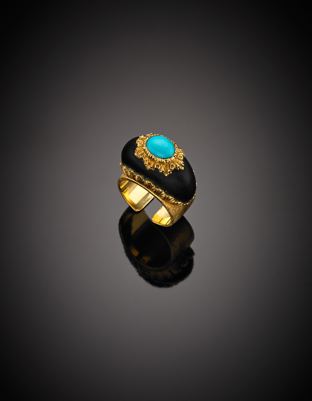 Anello "brisè" in oro giallo cesellato ed ebano, rifinito con turchese ovale cabochon, g 11,81 misura 9/49.