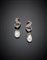 Orecchini pendenti con clip a guisa di piuma in oro bianco e giallo, diamanti rotondi e a cuscino, zaffiri ovali e rubini carrè, a sostenere due perle a goccia di mm 13,55 circa, g 26,85, lungh. cm 6 circa.