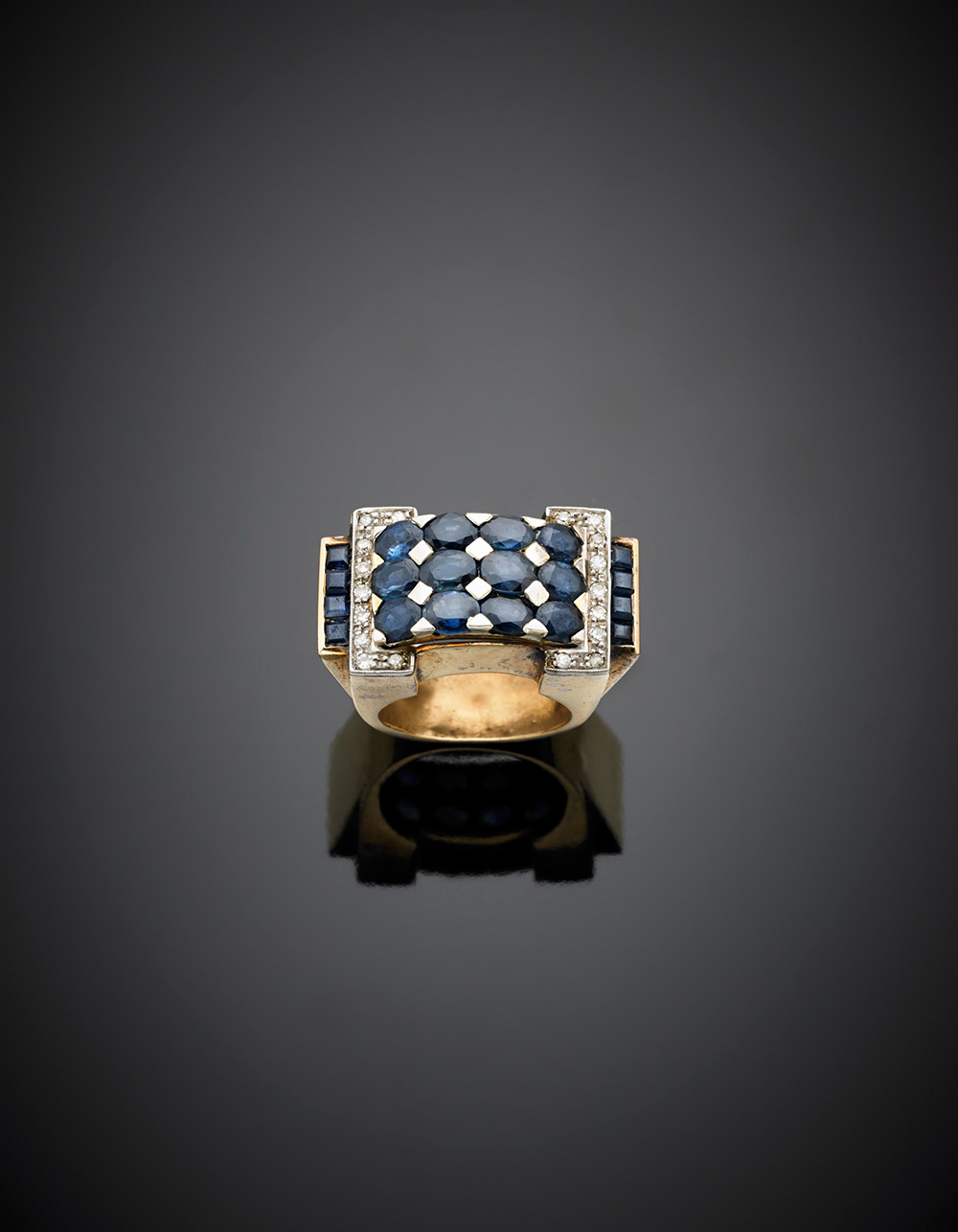 Anello a guisa di fibbia in oro giallo rossastro con diamanti rotondi, zaffiri ovali e carrè, dettagli in oro bianco, g 13,70 misura 14/54. (difetti)
