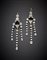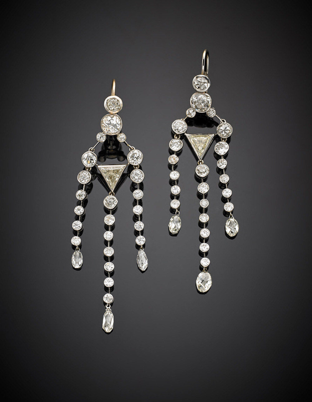 Orecchini pendenti in oro bianco con diamanti rotondi, al centro due triangolari e terminati da sei briolette, complessivi ct.13 circa, g 12,62, lungh. cm 7,10 circa.