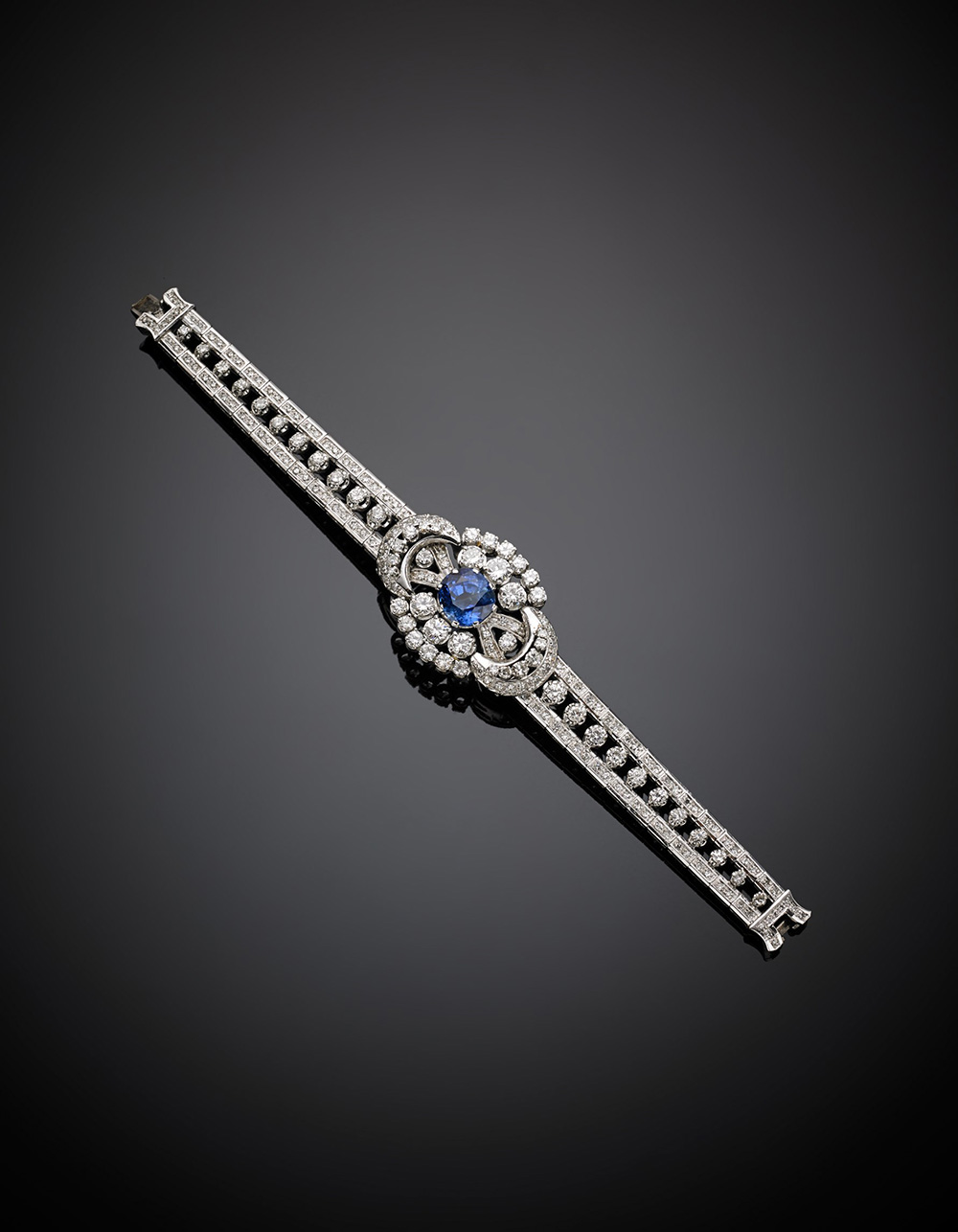 Bracciale in oro bianco con diamanti rotondi, al centro uno zaffiro ovale di...