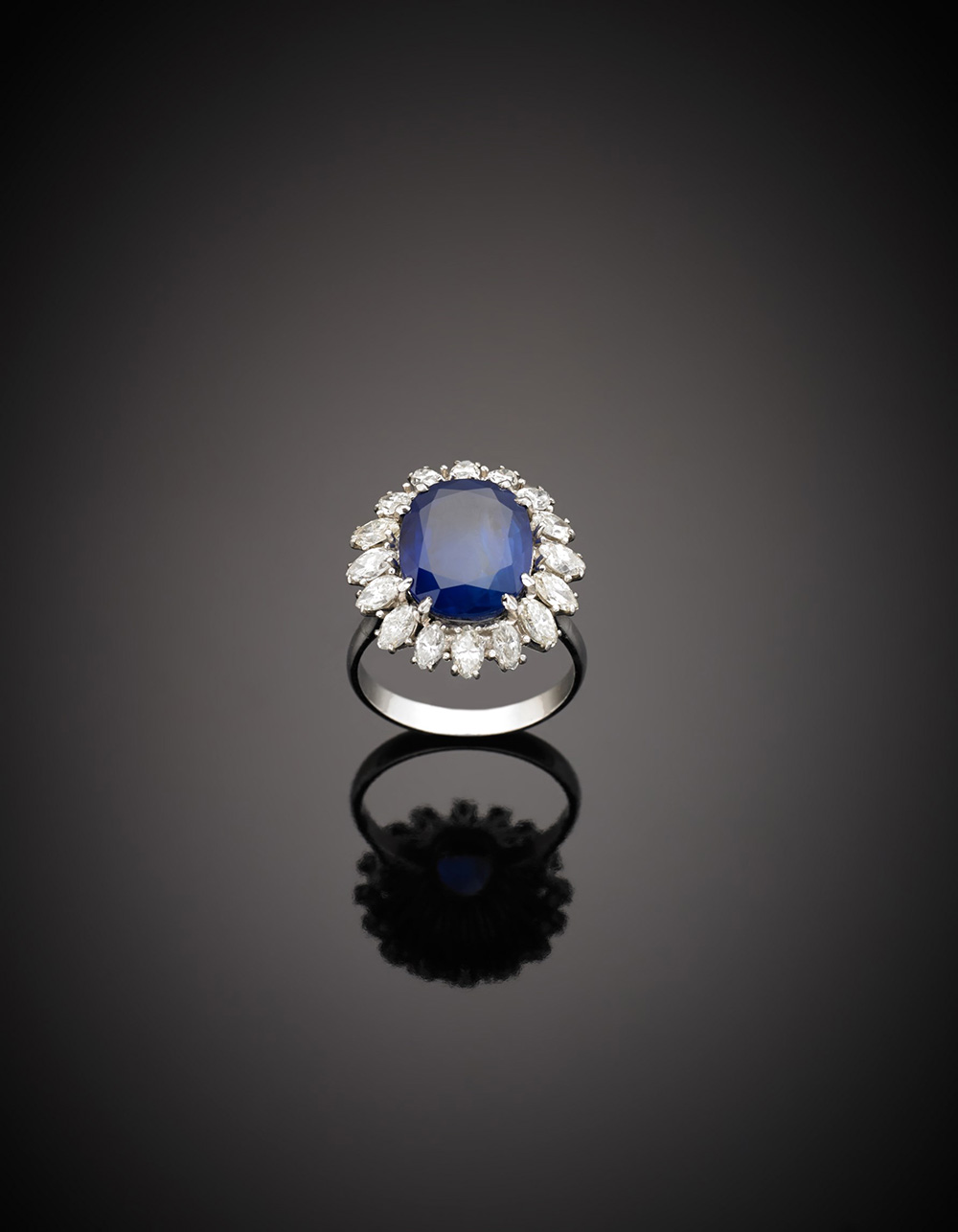 Anello in oro bianco con diamanti rotondi a contornare uno zaffiro ovale di ct. 6,70 circa, g 8,38 misura 13/53.