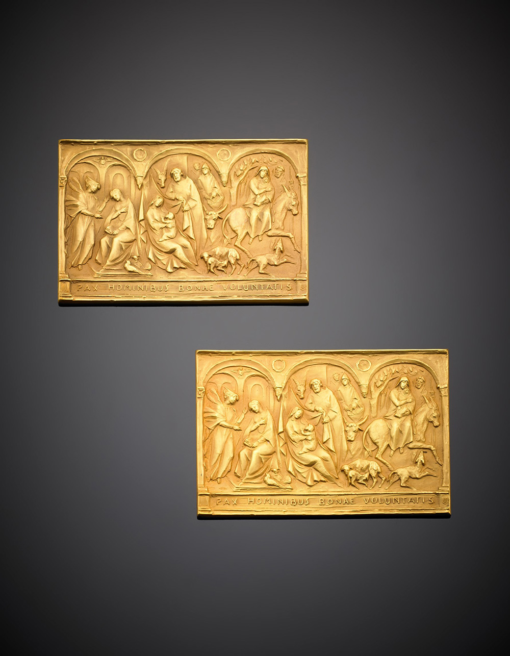 Lot composed of two yellow 900/1000 gold castings モPAX HOMINIBUS BONAS VOLUNTATESヤ, in all g 317.12. In original boxes with guarantees