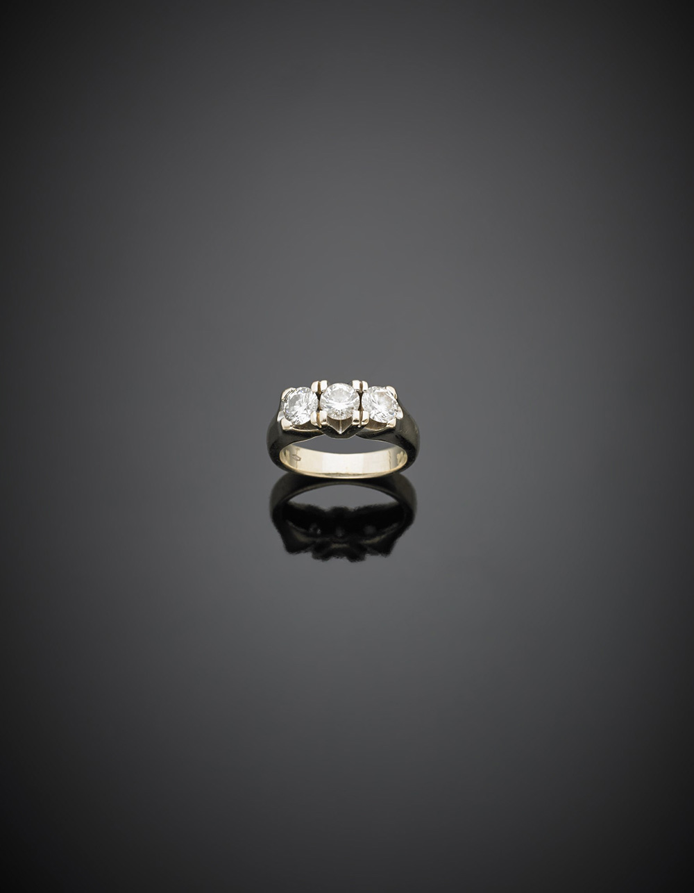Anello trilogy in oro bianco con tre diamanti rotondi taglio a brillante,, per complessivi ct. 1,00 circa g 5,90 misura 7/47.