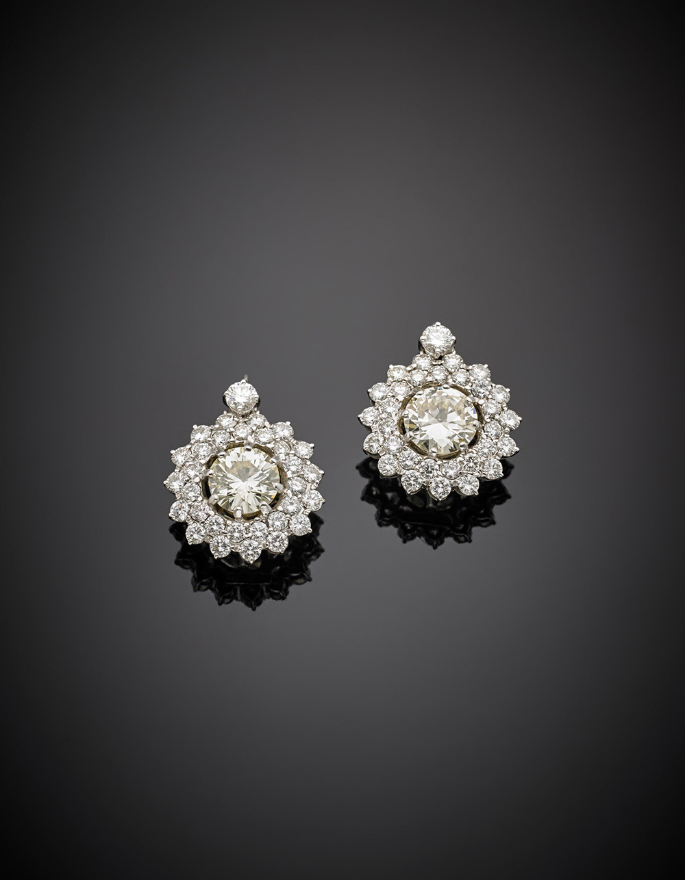 White gold ct. 3.80 circa and ct. 3.50 circa diamond earrings with diamond surround, in all ct.12.80 circa g 12.05.