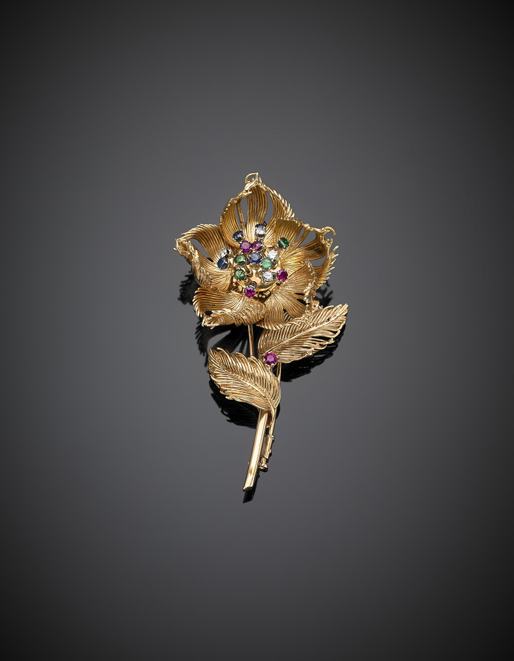 Pink gold diamond, sapphire, ruby and emerald accented flower brooch with shifting petals and pistils, g 34.68, length cm 7.60 circa. Marcato CARTIER n.017295 In Cartier case not pertinent