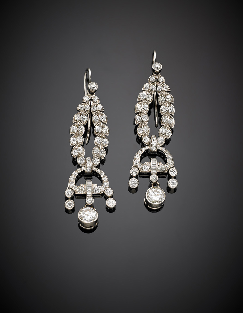 Orecchini pendenti a monachella con motivo a ghirlanda in oro bianco e diamanti a terminare due solitari di ct. 1,20 cad circa. complessivi ct.5,50 circa g 21,66, lungh. cm 6,50 circa.