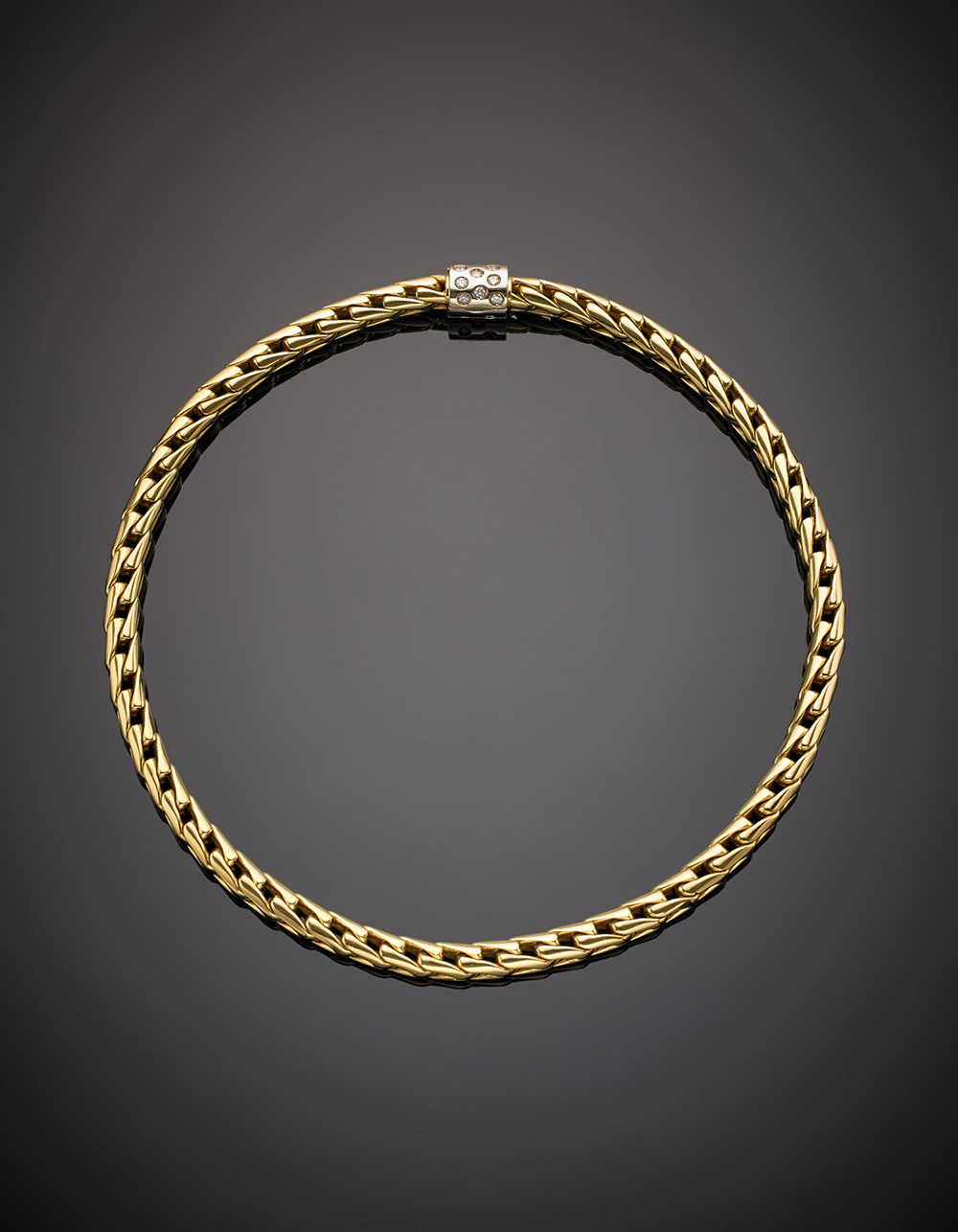 Collier in oro giallo a maglia intrecciata e diamanti sulla chiusura, g 133,20, lungh. cm 41 circa.