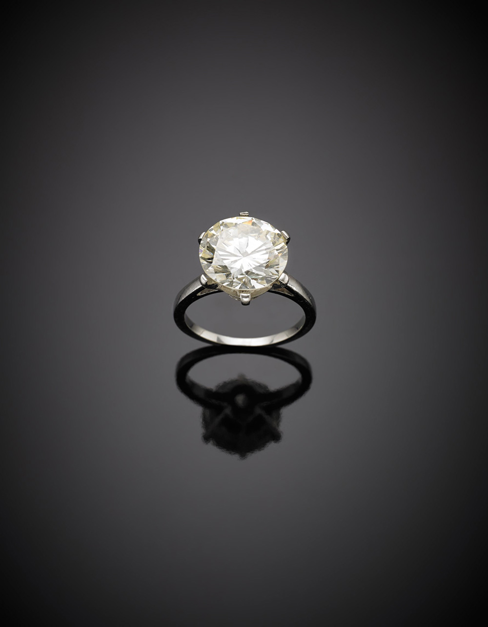 Anello in oro bianco con grande diamante solitario di ct. 5,19 taglio a brillante, g.5,63 misura 10/50.