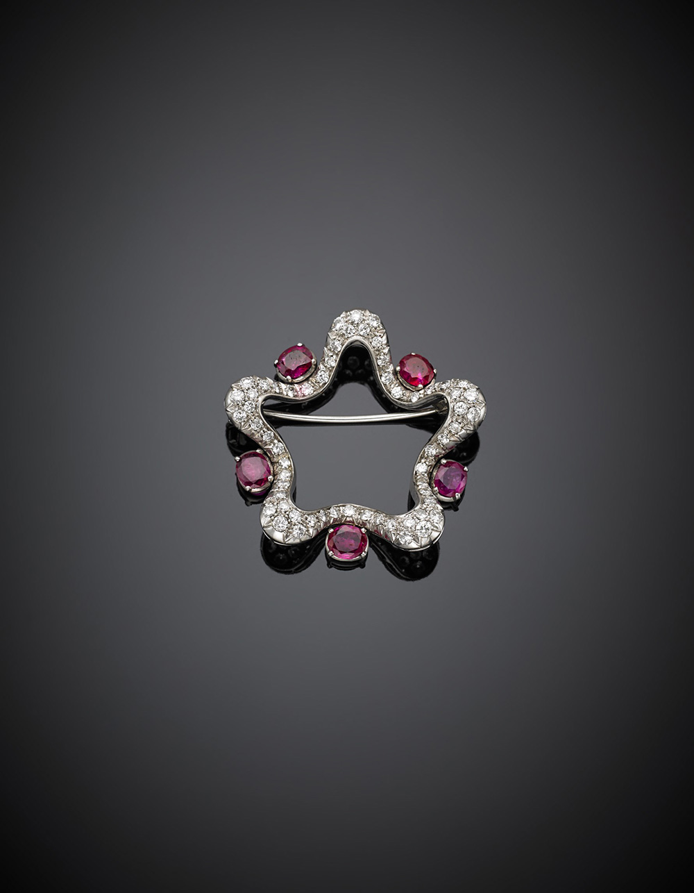 Broche a onde in oro bianco con pavè di diamanti e rifinita con rubini ovali per complessivi ct.3.,70 circa, g 10,45, diam. cm 3,70.