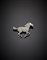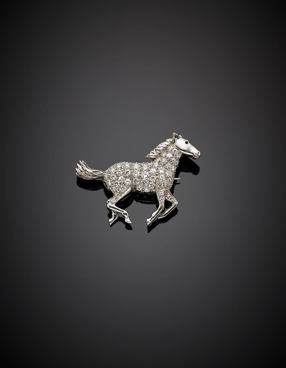 Spilla a guisa di cavallo in oro bianco e pavè di diamanti, g 9,13, lungh. cm 3,80 circa.