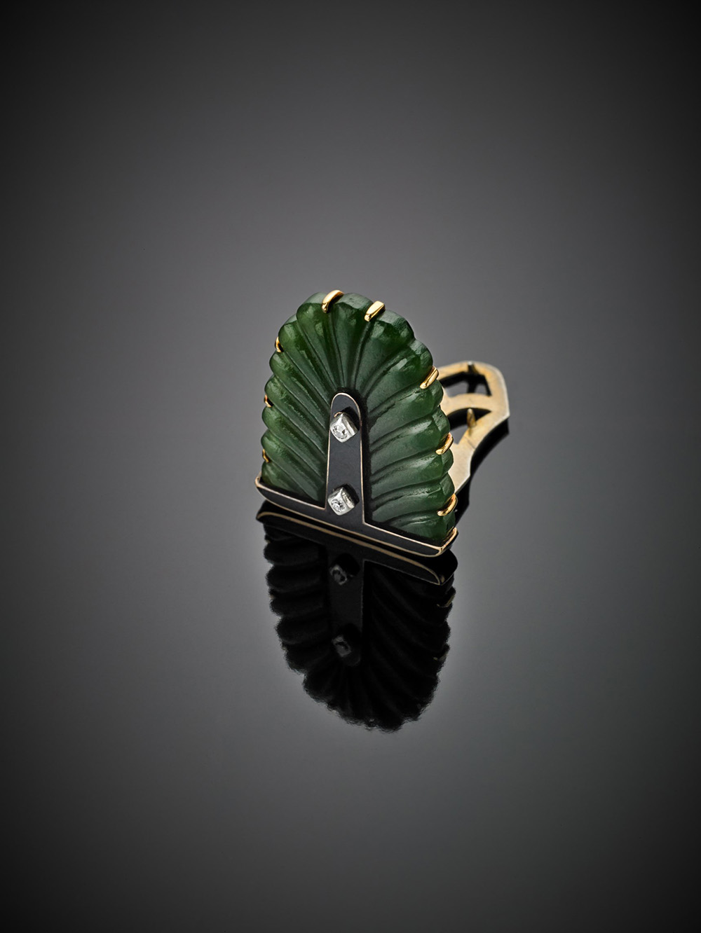 Broche in oro giallo e bianco con nefrite scolpita a foglia di palma rifinita con smalto nero e diamanti, g. 10,30, h cm 2,80 circa g 10,30, h cm 2,80 circa.