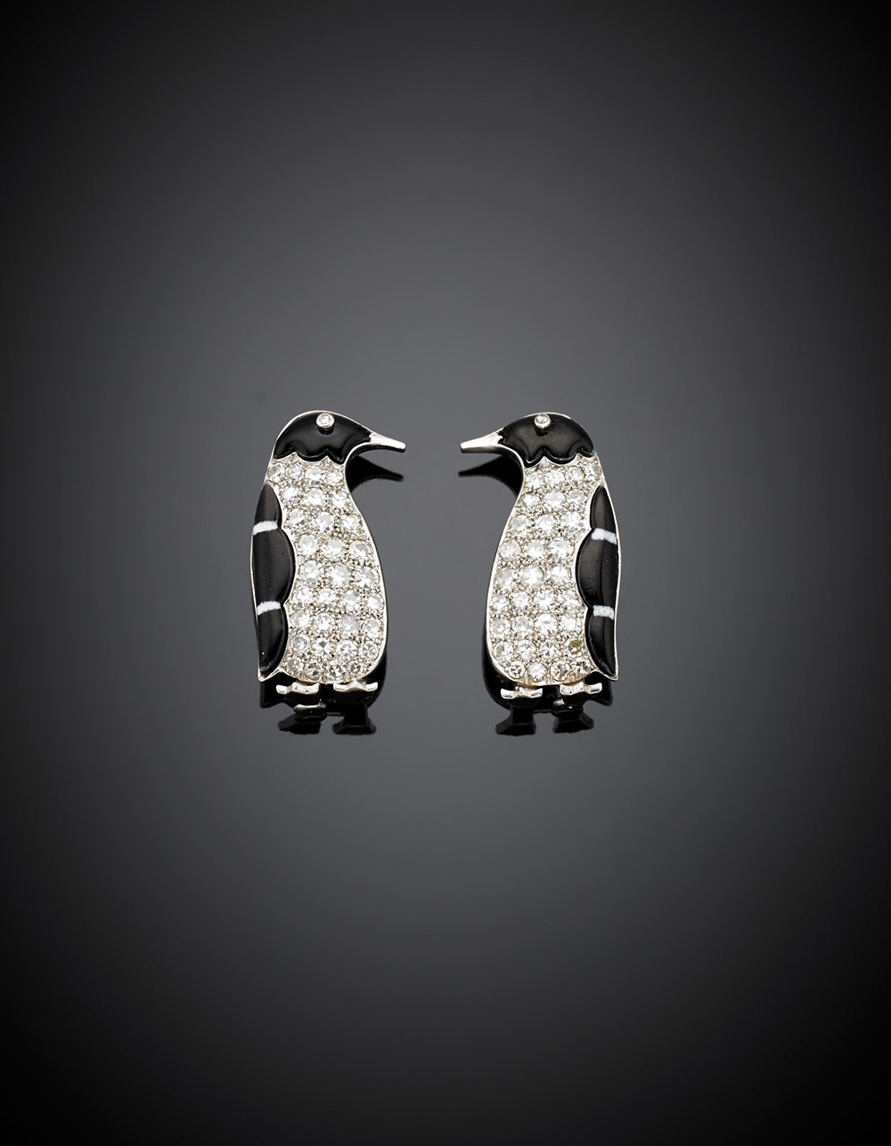 Due broche a guisa di pinguini in oro bianco, onice e diamanti, g 9,97, lungh. cm 2,60 circa.