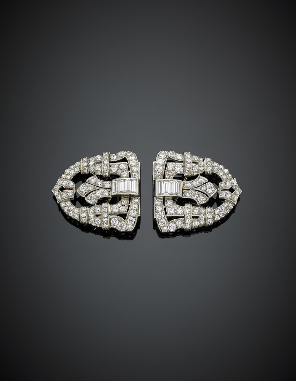 Doppia broche in platino con diamanti rotondi e a baguette per complessivi ct. 7,20 circa, g 20,00, lungh. cm 3,2 circa.
