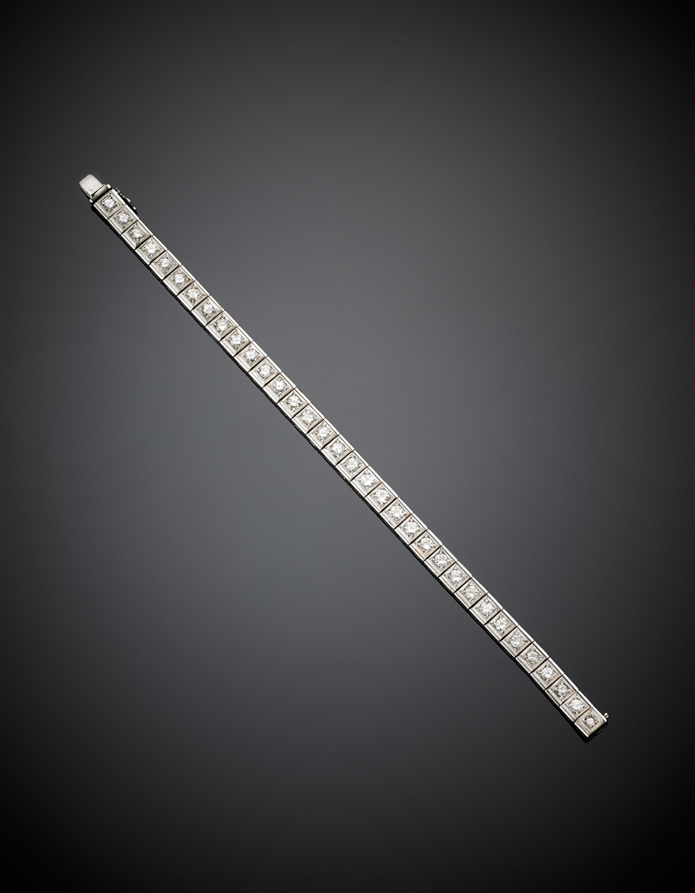 Bracciale tipo "tennis" in oro bianco e diamanti rotondi a montatura quadra, per complessivi ct. 5/5,50 circa, g 27,67, lungh. cm 17,40 circa.