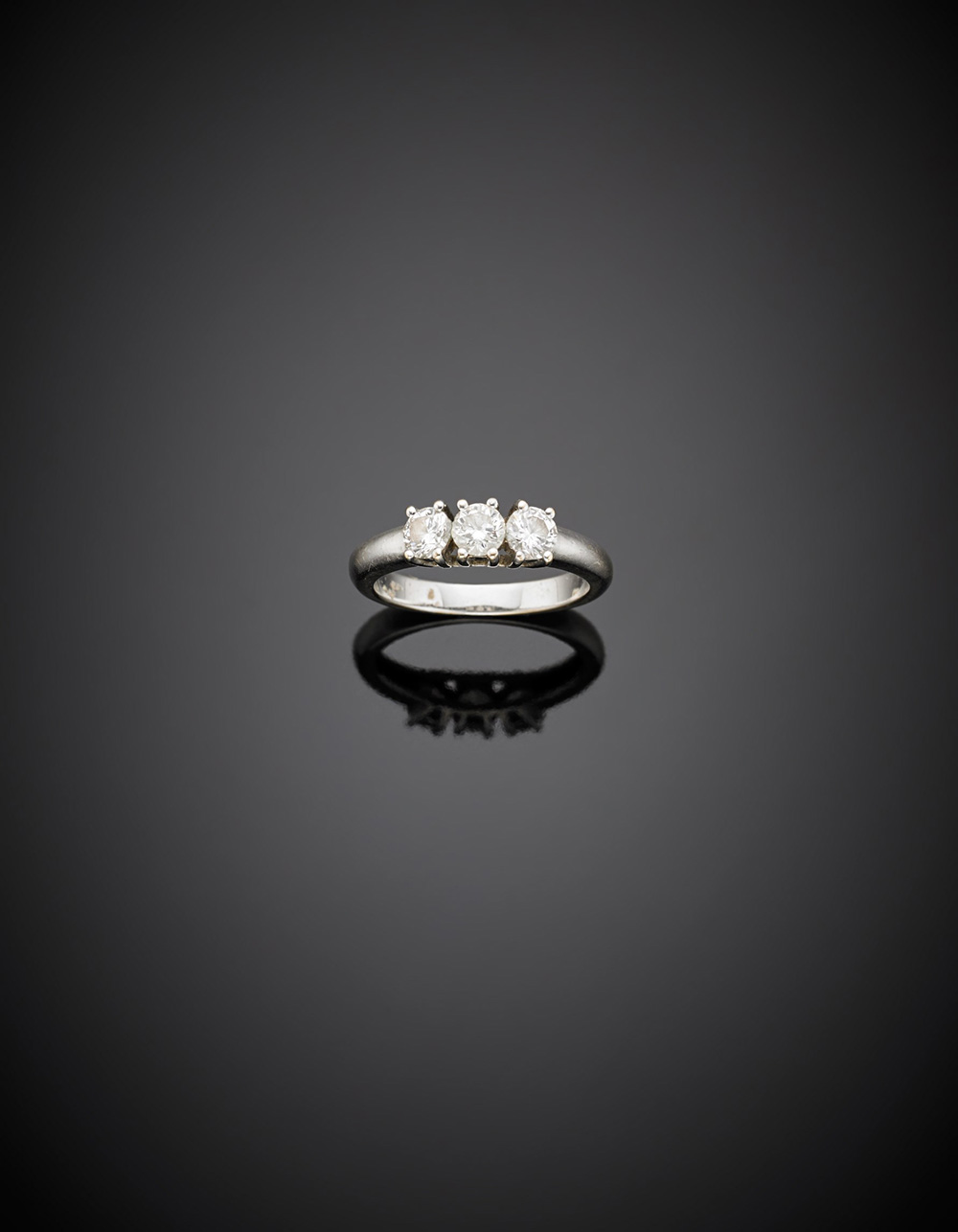 Trilogy in oro bianco e diamanti, per complessivi ct. 0,75 circa, g 4,58 misura 15/55.White gold three diamond ring, in all ct. 0.75 circa, g 4.58 size 15/55.