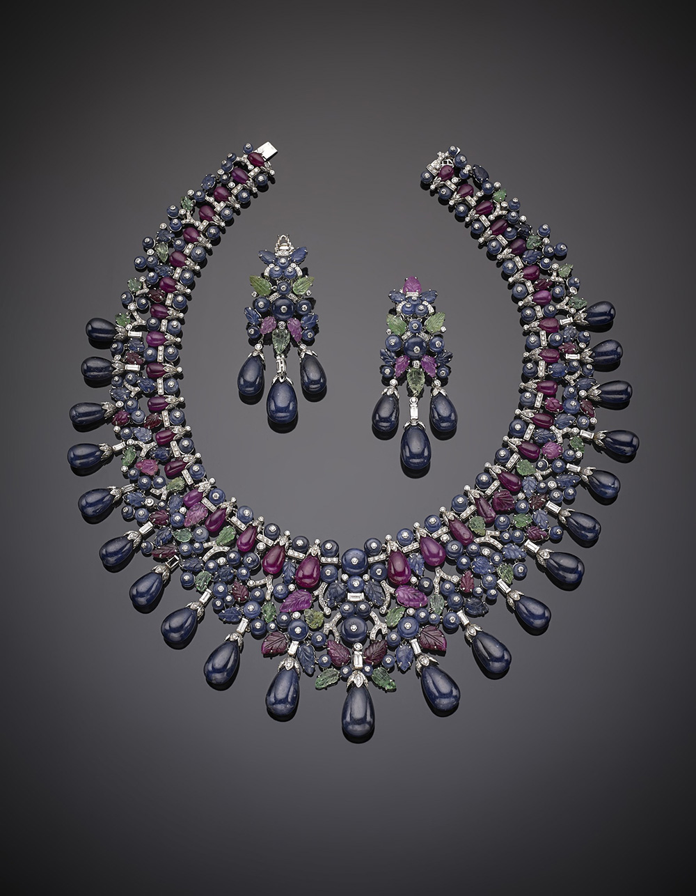 Demi-parure "tutti i frutti" formata da collier ed orecchini in oro bianco, diamanti, smeraldi, rubini e zaffiri in parte scolpiti e in parte a goccia g 260,10, lungh. cm 41,00, h cm 6,50 circa. (mancanze)