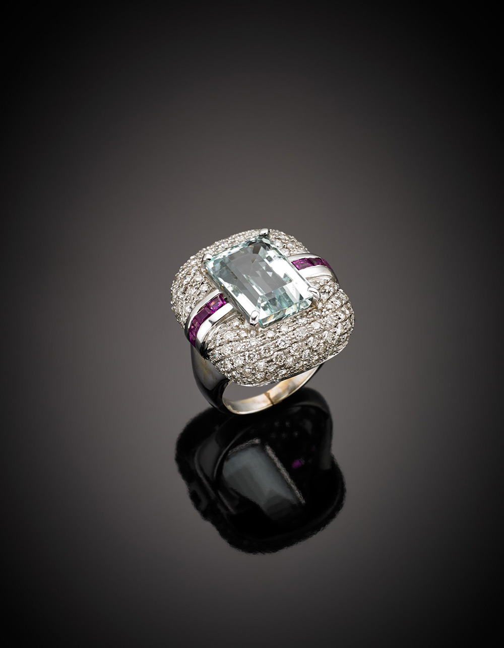 Anello in oro bianco a fascia bombata con acquamarina rettangolare di ct. 9,7 circa, pavè di diamanti e rubini carrè, g 21,08 misura 15/55.