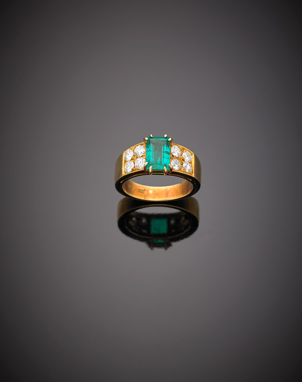 Anello in oro giallo a fascia con diamanti e smeraldo rettangolare di ct....