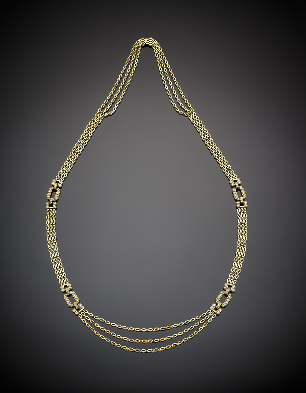 Catena lunga a tre fili modulari intercalata da fibbie snodate con diamanti, g 114,5, lungh. cm 87,5 circa. Marcato 1974 AL
