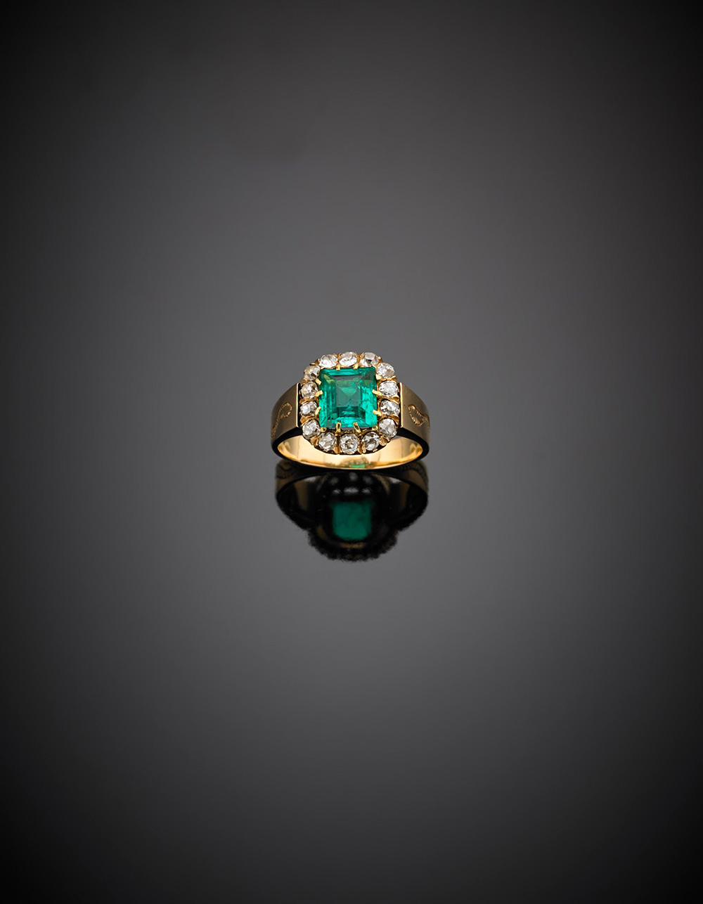 Anello a fascia in oro giallo inciso con smeraldo rettangolare di ct. 1,70 circa contornato da diamanti, g 6,60 misura 15/55.