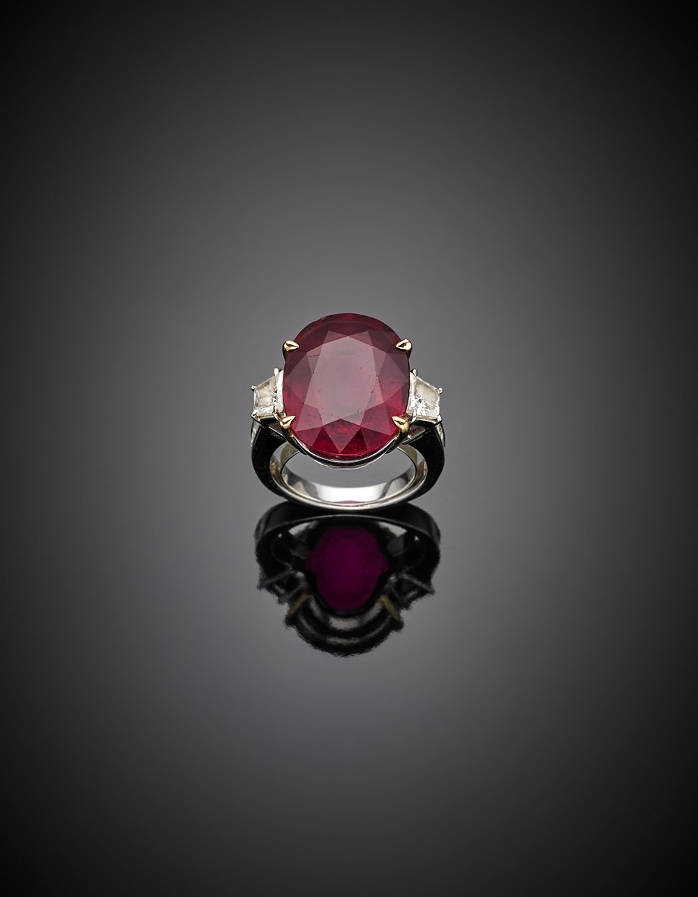 Anello in oro bianco con rubellite ovale di ct. 13 circa e diamanti trapezoidali e rotondi, g 11,04 misura 11/51.Accompagnato da Analisi Gemmologica CISGEM n.7941 del 23/10/2017, MilanoWhite gold round and trapezoidal diamond and ct. 13 circa rubellite ring, g 11.04 size 11/51.Appended Gemmological Report CISGEM n.7941 23/10/2017, Milano