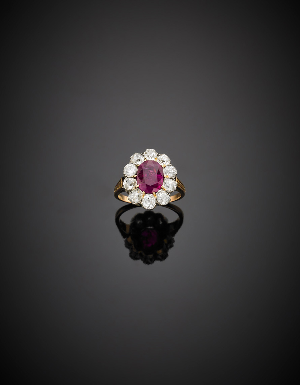 Bi-colored gold ct. 2.90 circa ruby and diamond cluster ring, in all ct.2.90 circa, g 6.55 size 13/53.