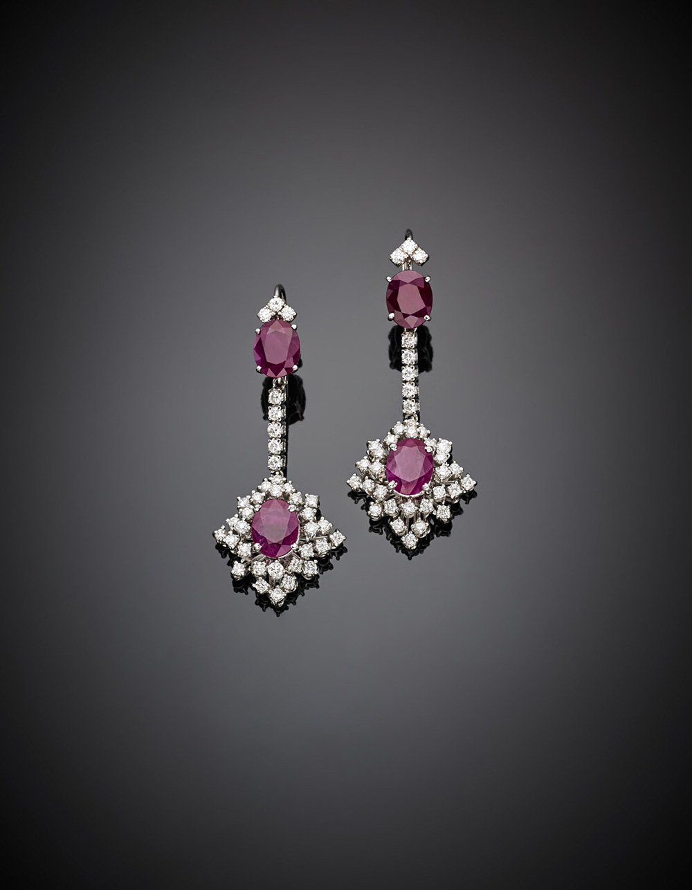Orecchini pendenti in oro bianco, diamanti rotondi e rubini ovali per complessivi ct. 7,40 circa, g 15,18, lungh. cm 4,90 circa.