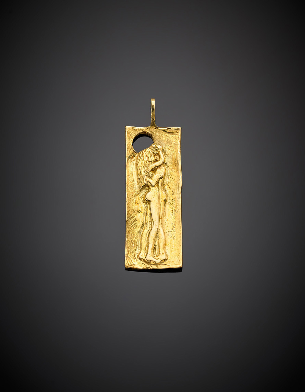 Medaglia scultura in oro giallo, g 10,78, lungh. cm 4,90, largh. cm 1,70 circa. Firmata PAZZAGLIA In scatola originale