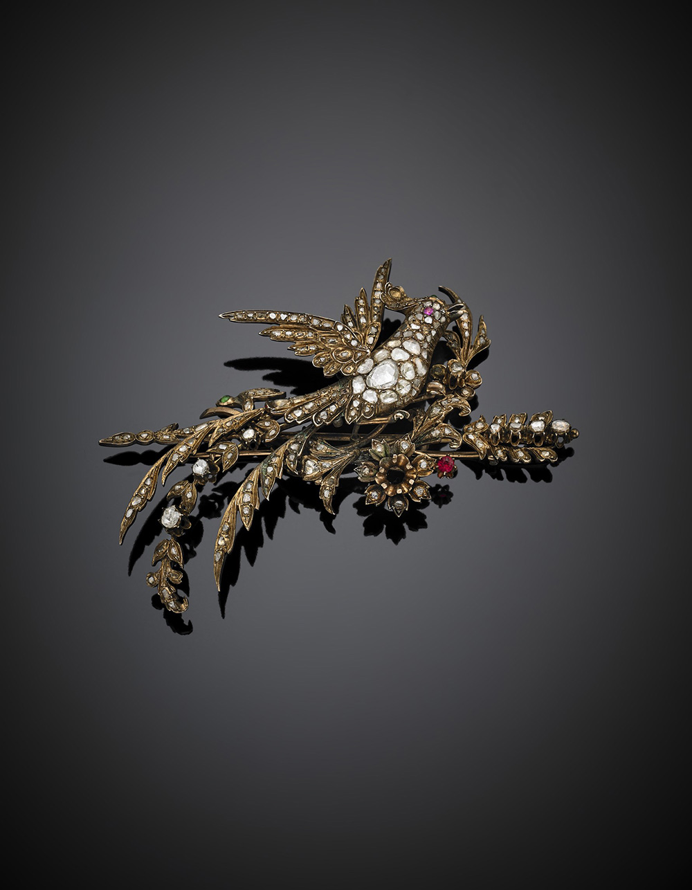 Broche a guisa di araba fenice con fiore e freccia in metallo dorato, rifinito con diamanti irregolari taglio mezza rosetta, pietre rosse e verdi, g 41,48, lungh. cm 10,20 circa. (mancanze)Antique Phoenix with flower and arrow diamond brooch, the rose cut diamonds and red and green gems are set in gilt metal, g 41.48, length cm 10.20 circa.(losses)