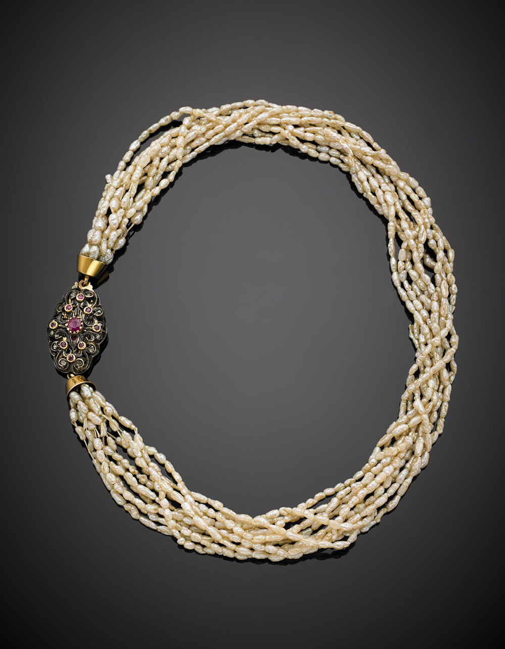 Collana multifili in perle d'acqua dolce a chicchi di riso e chiusura in oro argento e rubini, g 38,68, lungh. cm 38,00 circa.