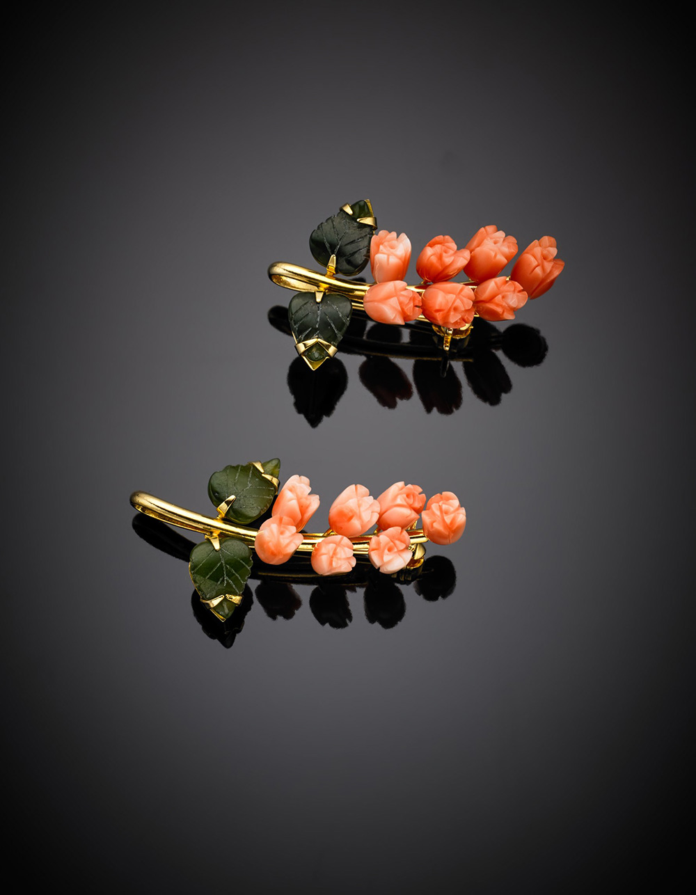 Due spille uguali a guisa di rami di mughetto in corallo rosa variegato e nefrite scolpiti, montatura in oro giallo, g 9,72, lungh. cm 3,80 circa.