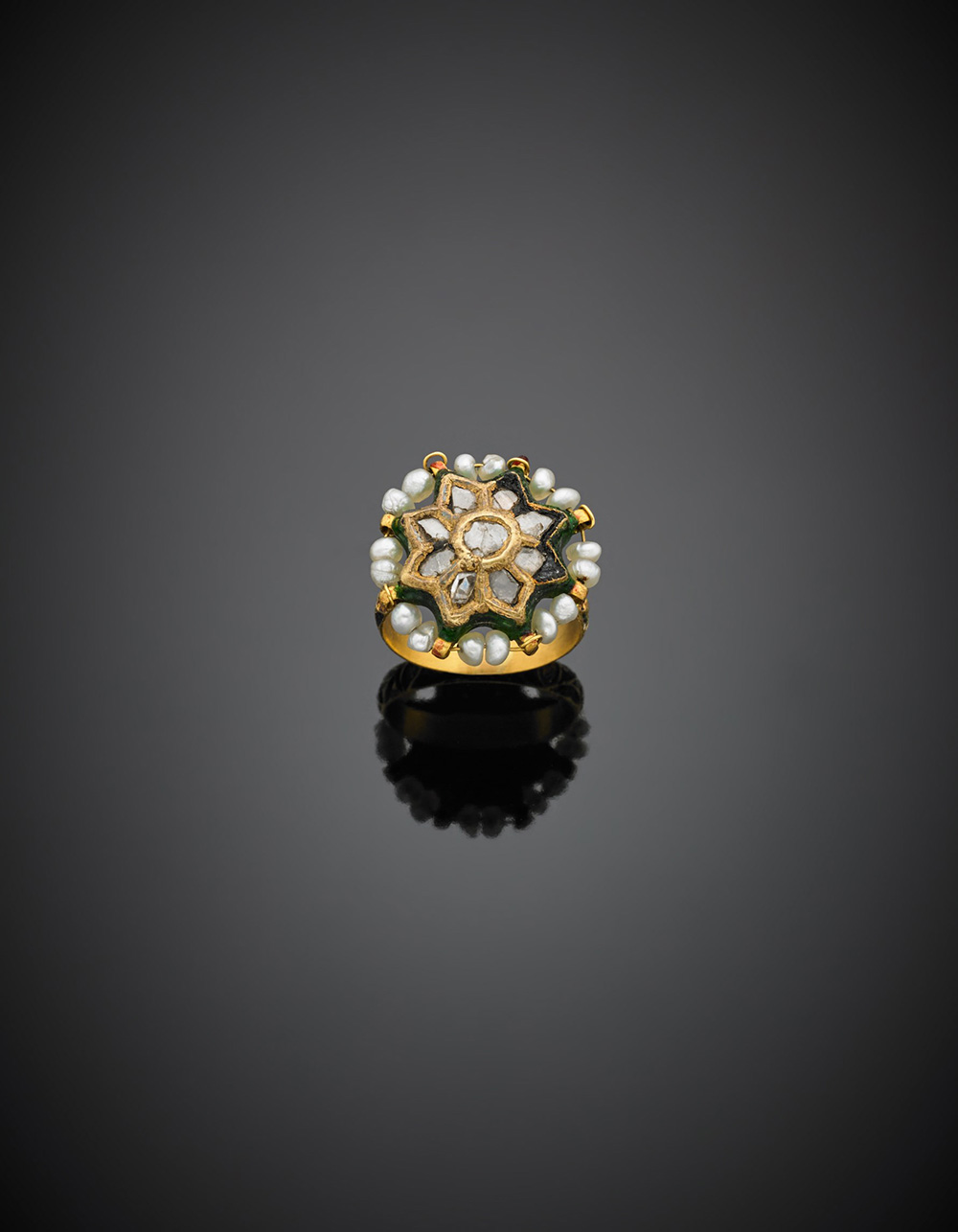Lot 1500 | Anello in oro giallo con diamanti flat irregolari, perle e finitura in smalti...