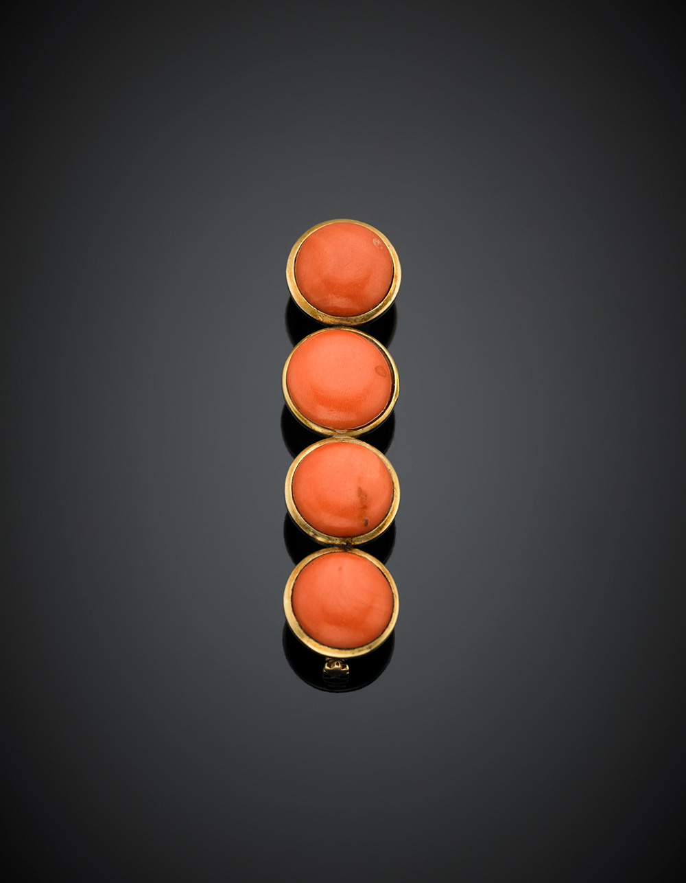 Spilla in oro giallo e quattro cabochon rotondi di corallo arancione, g 8,30,...