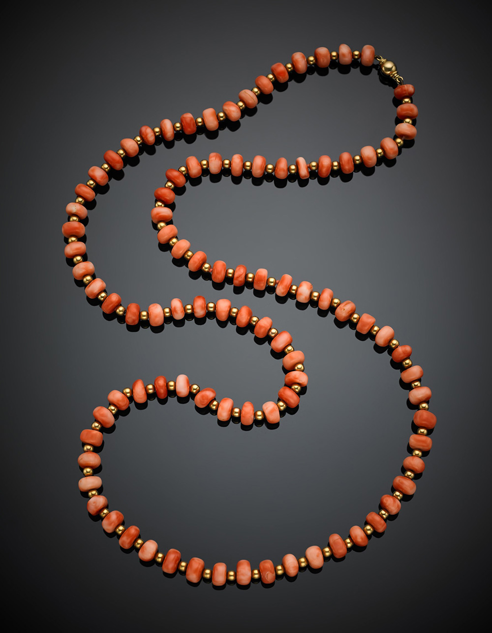 Lunga collana in corallo a barilotti arancione variegato, distanziati da boules in oro giallo come la chiusura, g 88,80, lungh. cm 89 circa.