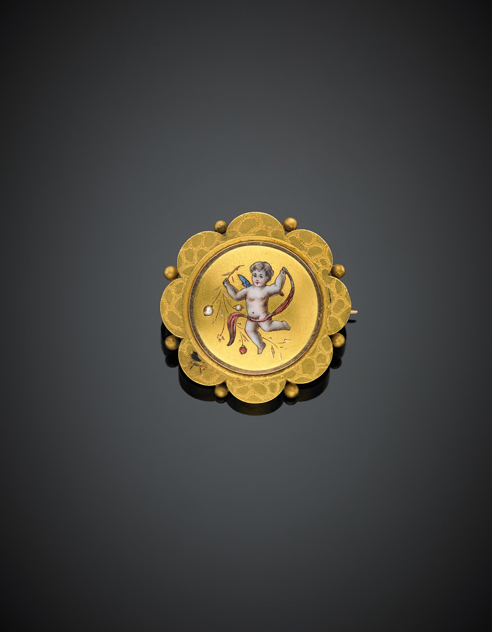 Spilla rotonda in oro giallo con angioletto smaltato e microperle, g 5,20, diam. cm 2,60.