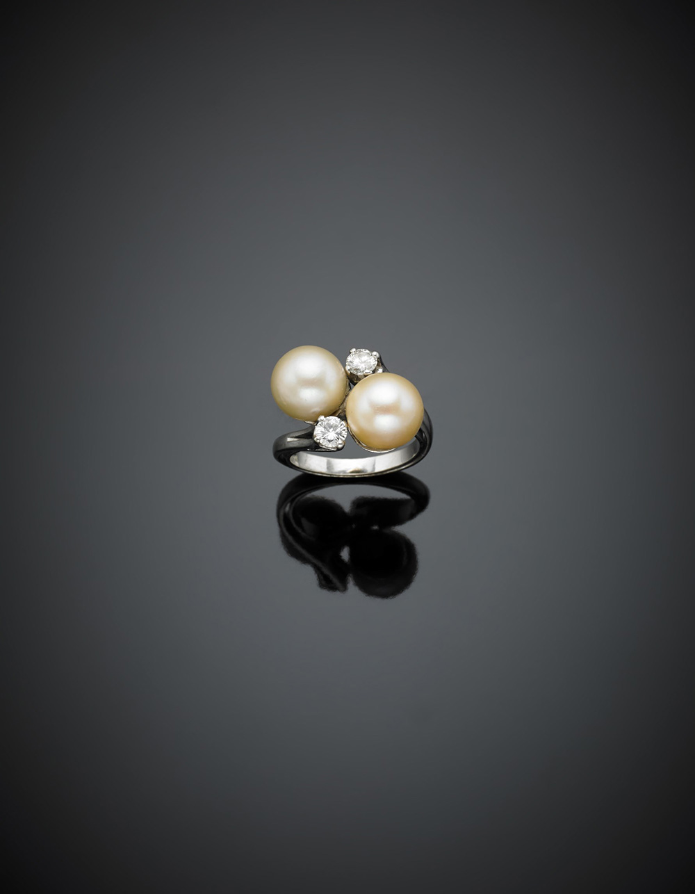 Anello a contrariè in oro bianco con due perle crème di mm 8,50-9 e due diamanti rotondi, per complessivi ct. 0,25 circa, g 6,90 misura 11/51 . Con contranello