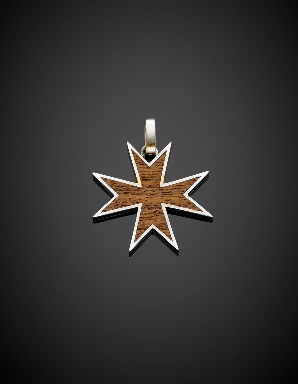 Croce di Malta in legno legata in oro bianco, g 15,44.Oak and white gold...