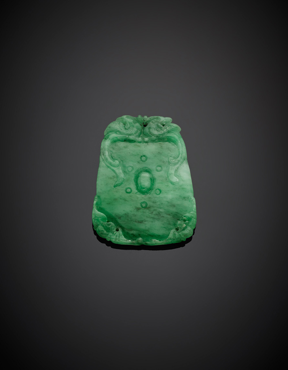 Giadeite verde trapezoidale scolpita g 26,01, lungh. cm 5,40, largh. cm 4,10 circa.